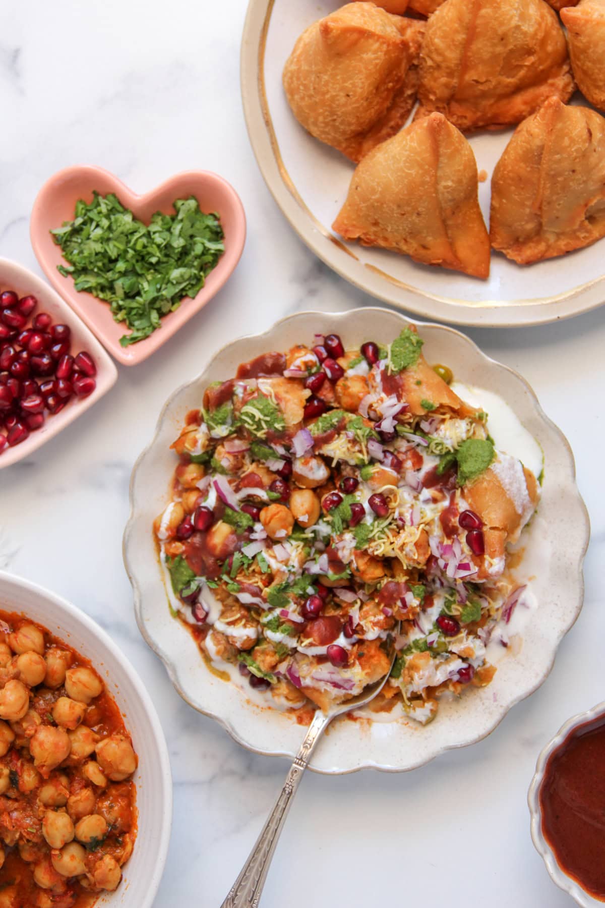If you love dishes that are bursting with flavor, fun to assemble, and guaranteed to impress, this Samosa Chaat is the one to make. It's as simple as layering golden, potato-filled samosas - homemade or store-bought frozen for busy days - with spiced chickpeas (chole), sweetened yogurt, cilantro-mint chutney, tamarind chutney, and a generous sprinkle of sev and pomegranate.